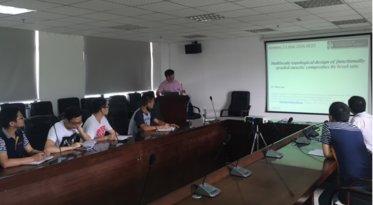 2016年6月13日,应高亮教授邀请,悉尼科技大学罗震博士来我院交流,并作了题为“Multiscaletopological optimization design of functionally graded auxeticcompositesby levelsets”的学术报告。