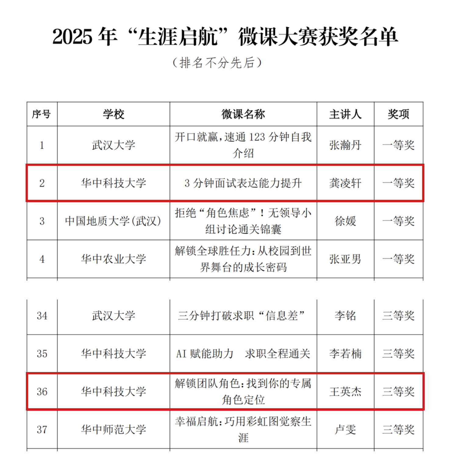9月18日,湖北省生涯教育研究会公布了2025年“生涯启航”微课大赛获奖名单,我院本科生辅导员龚凌轩作品《3分钟面试表达能力提升》荣获一等奖、王英杰作品《解锁团队角色:找到你的专属角色定位》荣获三等奖。