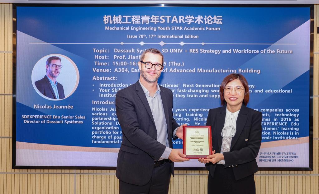会议结束后,尼古拉・让内博士为机械学院师生做专题报告,分享了达索系统的工业软件技术路线图、融合生成式人工智能技术的新一代“3D UNIV+RSES”平台,以及在不同工程领域和大学创新实践教育方面的应用案例。张芬为其颁授报告纪念牌。
