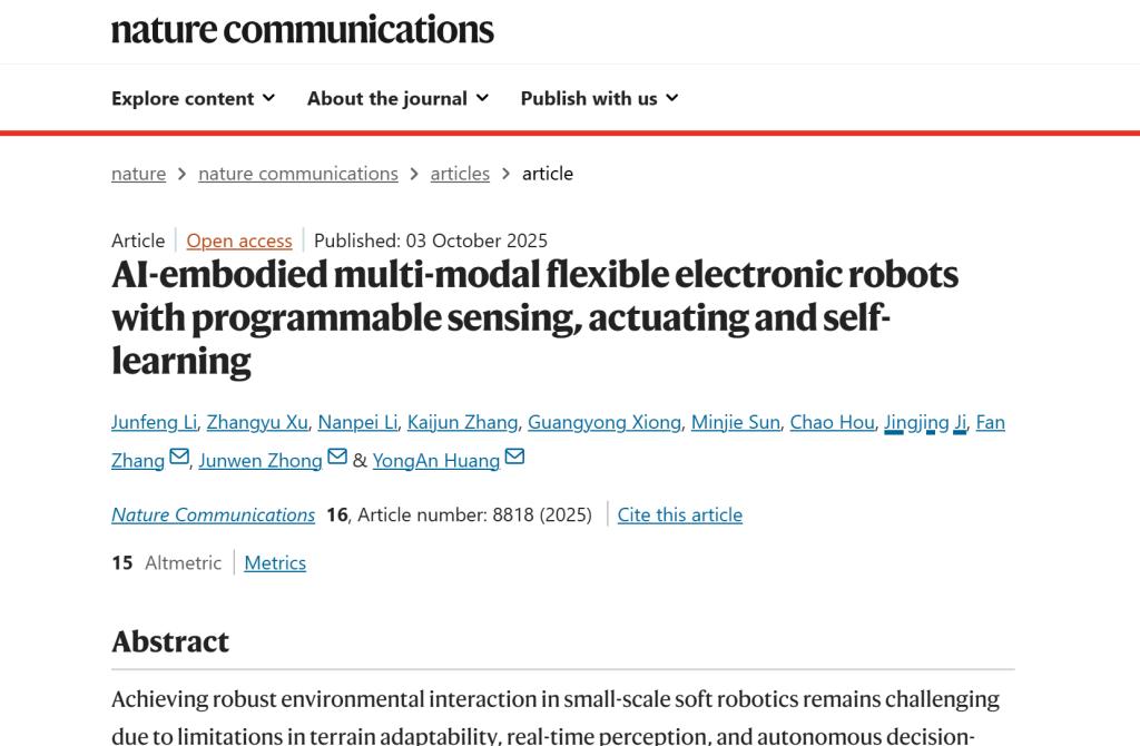 10月3日,我院教授黄永安、副研究员张帆联合澳门大学教授钟俊文、武汉理工大学副教授李军锋在《Nature Communications》发表题为“AI-embodied multi-modal flexible electronic robots with programmable sensing, actuating and self-learning(具身智能可编程感知、驱动与自学习的多模态柔性电子机器人)”的研究论文。该论文提出了一种模块化柔性电子机器人开发框架,通过紧密集成的传感、驱动与决策架构,最终赋予机器人更高级的环境智能。李军锋为本文的第一作者,黄永安、张帆、钟俊文为本文共同通讯作者。