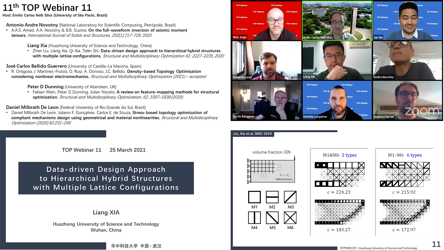 3月25日,我院机械电子信息工程系副教授夏凉受巴西圣保罗大学Emilio CN Silva教授的邀请,于第11期国际“拓扑优化”线上研讨会(TOP Webinar)作邀请报告。本期线上研讨会共邀请来自巴西、中国、英国和西班牙的5位研究学者分享最新研究进展。报告中,夏凉介绍了课题组近期发展的一种基于子结构建模的梯度渐变混合点阵结构设计方法,为“设计与制造一体化”多级次结构拓扑优化设计提供了全新研究思路;报告获得国际结构与多学科优化协会(ISSMO)前任主席、丹麦皇家科学院院士Ole Sigmund教授在内多位学者的关注与讨论。