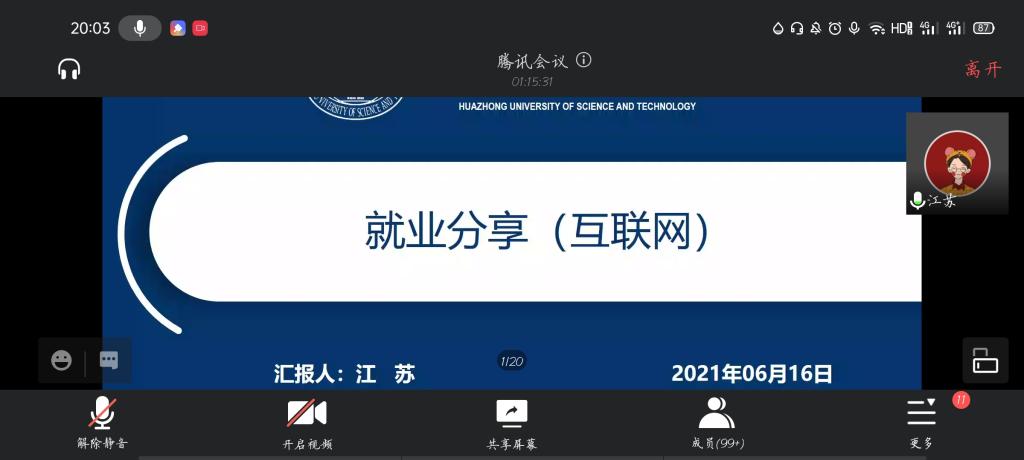 6月16日晚上7点,“信息化前沿”专场就业分享会在线上举行,分享嘉宾为2018级硕士毕业生张士羿、江苏、徐毅之和2020届毕业生校友尹洋。张士羿结合自己的经历分享了找工作前的准备工作、面试技巧及就业选择经验;江苏分享了收集求职信息、投递简历及总结面试经验的技巧;徐毅之强调了选择的重要性,并结合自己的求职历程提供了建议;尹洋分享了求职准备工作及offer选择的相关心得。