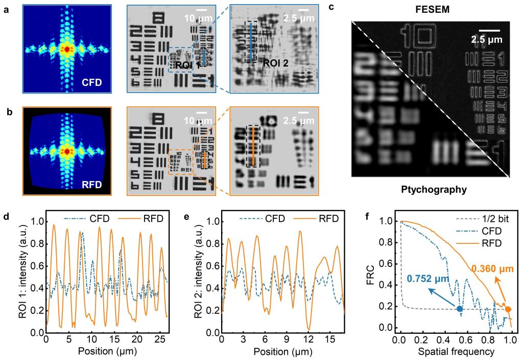 基于上述成像框架,本研究在CDI中验证了完美传递函数的理论可行性,并成功将成像分辨率推至阿贝衍射极限。特别是在无透镜叠层衍射成像中,研究团队于接近0.9的超高NA系统下,将成像因子k优化至0.501,逼近了阿贝分辨率极限。凭借超高NA与逼近阿贝极限的k因子,最终在CDI系统中实现了0.57 λ的近半波长级横向分辨率,研究结果如上图所示。
