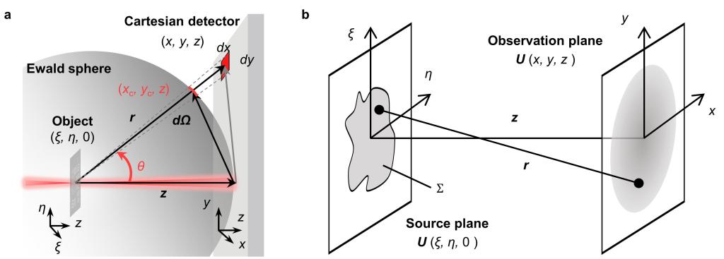 自由空间光场传播:a 埃瓦尔德球效应;b 瑞利-索末菲衍射的传播几何示意