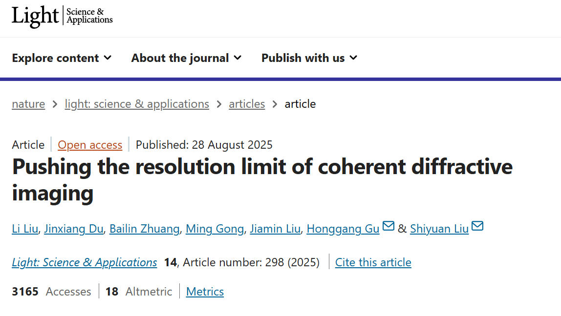 8月28日,Nature旗下光学顶级期刊《Light: Science & Applications》刊发我院机械电子信息工程系刘世元教授、谷洪刚教授团队在相干衍射计算成像领域最新成果,并被选为期刊封面文章,题为“Pushing the resolution limit of coherent diffractive imaging(逼近相干衍射成像分辨率极限)”。我院2021级博士生刘力为论文第一作者,刘世元教授和谷洪刚教授为通讯作者。