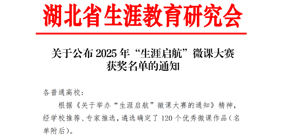 据悉,自湖北省高等学校毕业生就业指导服务中心3月发布《关于举办“生涯启航”微课大赛的通知》以来,经湖北省各普通高校推荐、专家推选,最终遴选确定了120个优秀微课作品,其中一等奖共10位。未来,我院将不断沉淀学生生涯规划指导教学实践经验,创新教学方法与模式,聚焦学生成长需求,牢固树立科学教育教学理念,持续为学生提供覆盖全程、专业精准兼具个性化的生涯发展指导服务。
