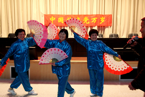 最后是联欢会。先由两位老同志朗读了自己的诗作(诗稿见附件),作者们歌颂了党的九十华诞、辛亥革命百年和2011年我国取得的伟大成就。其中九十岁的谭丕林老师,还用家乡话诵吟了宋朝王安石的诗《元日》。接着老同志们还展示了自编自演的节目,有养生讲演、双扇舞《女儿情》,单人舞《走西口》和《桃花谣》、京剧清唱《我们是工农子弟兵》,以及七人男女声小合唱《真情还在老地方》等。