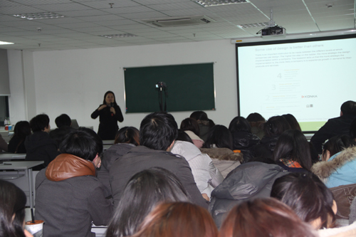 交流中,安女士以香港邮政局为例向同学们详细介绍了如何能有效地帮助企业提高市场竞争力的方法。引起了大家对设计创新的强烈兴趣,开拓了同学们的设计视野。安芯仪 (Elaine Ann)女士在此次学术交流中,通过大量的案例讲解了产品设计中的以人为本的用户研究方法,以及做出中国原创设计的重要性。