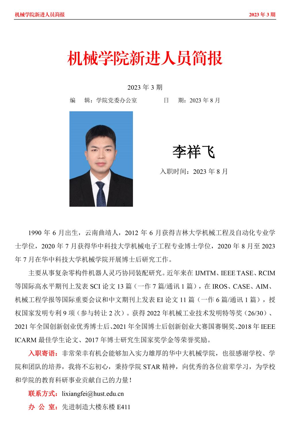 新进人员简报丨李祥飞( 智能制造装备与技术全国重点实验室)