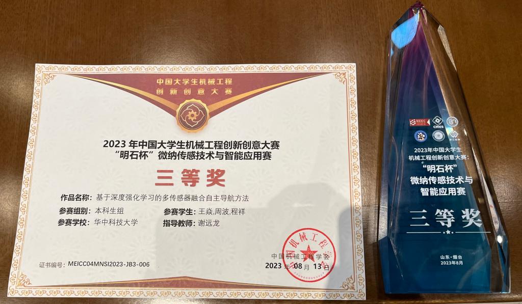 8月11日至13日,2023年中国大学生机械工程创新创意大赛“明石杯”微纳传感技术与智能应用赛在山东烟台顺利举行。在本次大赛中,由谢远龙老师指导,王焱、周波、程祥同学完成的项目《基于深度强化学习的多传感器融合自主导航方法》荣获本科生组全国三等奖(获奖比例15.3%)。