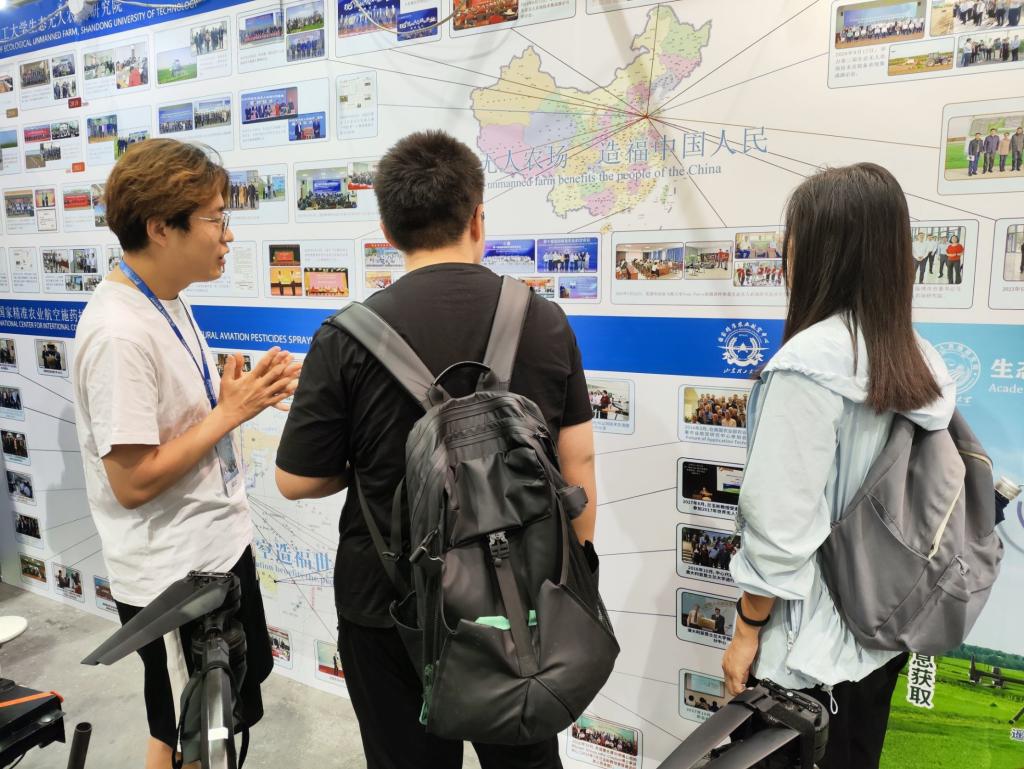 在会上,实践队有幸与两个研究院的科研团队深入交流,山东理工大学生态无人农场研究院在智能化生态无人农场的研究中取得很大进展。生态无人农场追求“天-空-地”一体化农田信息获知,针对耕种管收实现全过程无人化作业,力图实现高效生产。