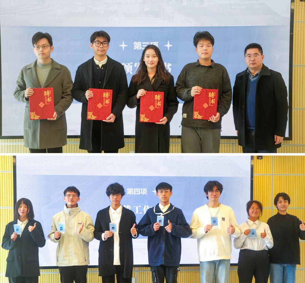 仪式上,段政为学生新闻中心主任团成员颁发聘书,梁栋为学生新闻中心工作人员代表佩戴工作证。