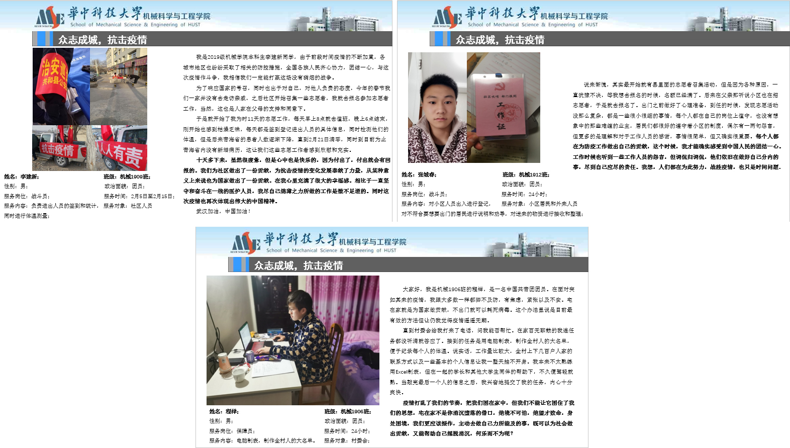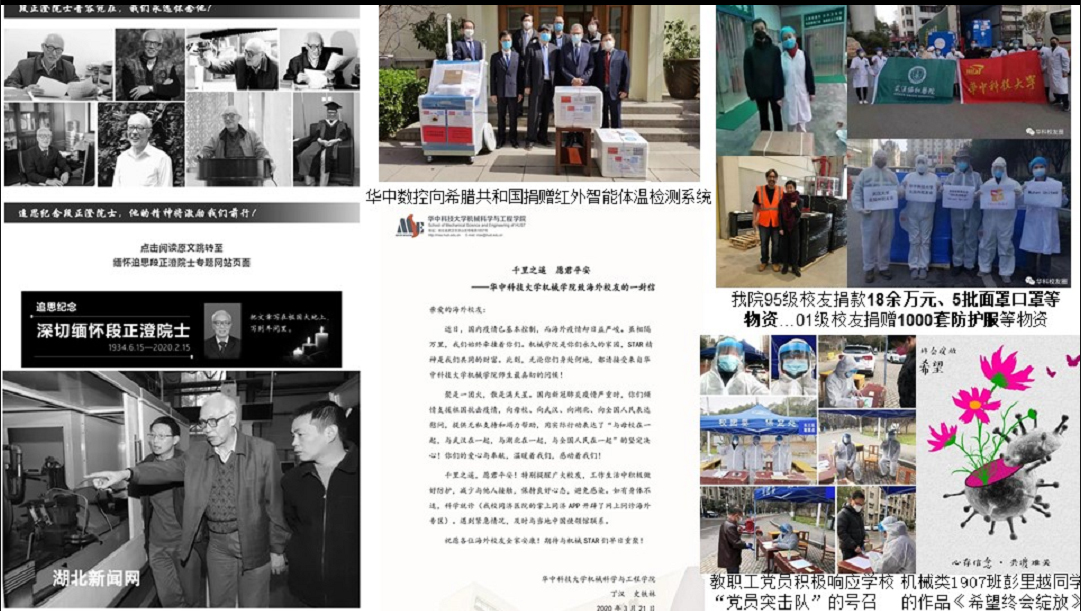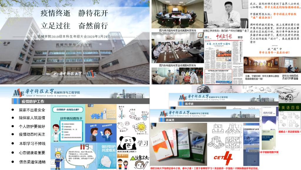 疫情防护工作,依然是目前所有工作的重中之重。至3月29日,武汉已“封城”66天,在这场战役中,无数逆行者迎难而上,一方有难,八方支援。华中大表现突出,是全国投入最多床位和医护人员的高校。机械学院充分发挥科研优势,推动抗击疫情工作。我院2019级的同学们用自己的方式为抗击疫情贡献一份力量,机械类1907班制作“武汉加油”的视频;程祥、李建新、张城睿等同学主动投身到社区志愿者工作中……辅导员呼吁同学们勇做担当民族复兴大任的新时代有志青年,疫情当前做到“不传谣,不信谣”,做好个人及家人的防护工作,保持良好的心态。
