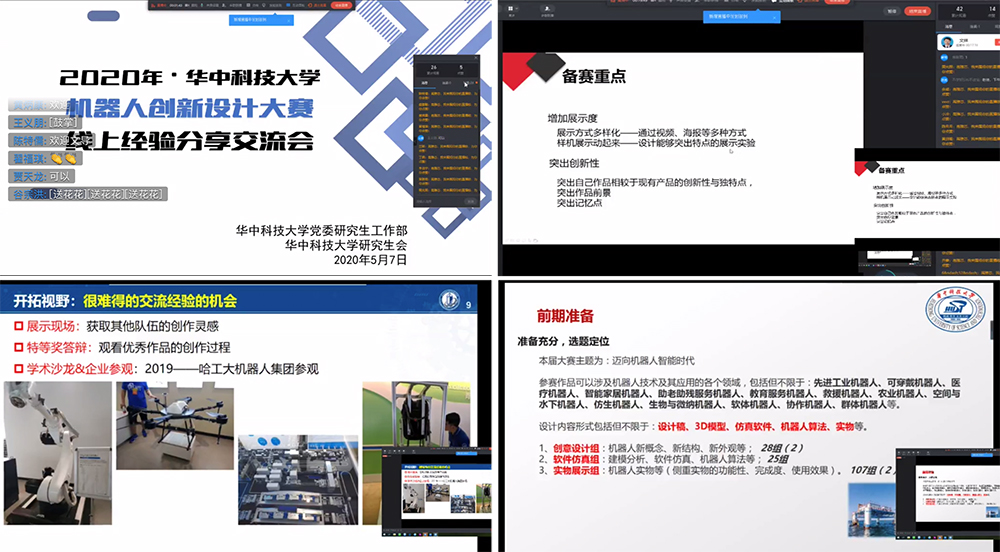 5月7日,由华中科技大学党委研究生工作部主办,yl23455永利官网研会、华中科技大学研究生会承办的“华中科技大学机器人创新设计大赛线上经验分享交流会”在钉钉平台上拉开帷幕,旨在为有意愿参加“第二届华中科技大学研究生机器人创新设计大赛”的同学们提供一个交流学习的平台。特别邀请yl23455永利官网研究生辅导员文祥、2019级博士生陈特儒与水电与数字化工程学院2017级硕士生贾天龙与大家分享参赛经验。