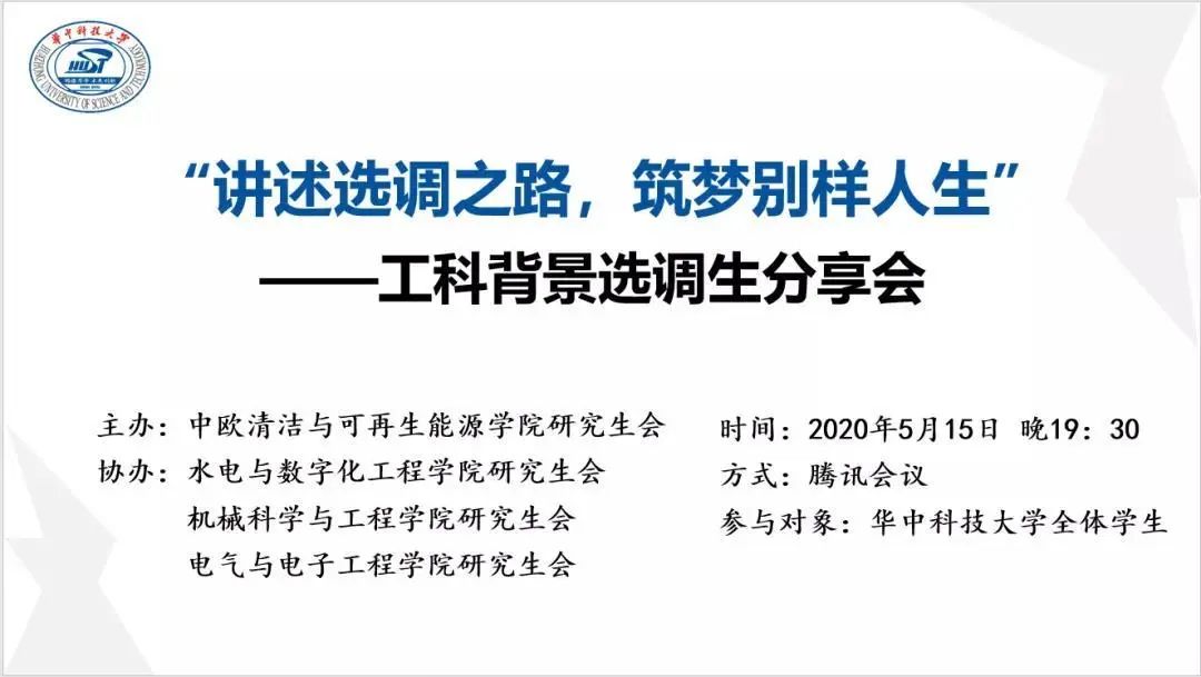 5月15日晚7:30,由中欧清洁与可再生能源学院研究生会主办,电气与电子工程学院研究生会、yl23455永利官网研究生会、水电与数字化工程学院研究生会协办的“工科背景选调生分享会”在腾讯会议平台顺利举行。本次活动邀请了校党委研究生工作部郑名扬老师、选调生校友、准选调生为我们讲解我校选调生政策、选调生工作日常以及笔试面试经验。中欧清洁与可再生能源学院辅导员梁媛媛参加活动。