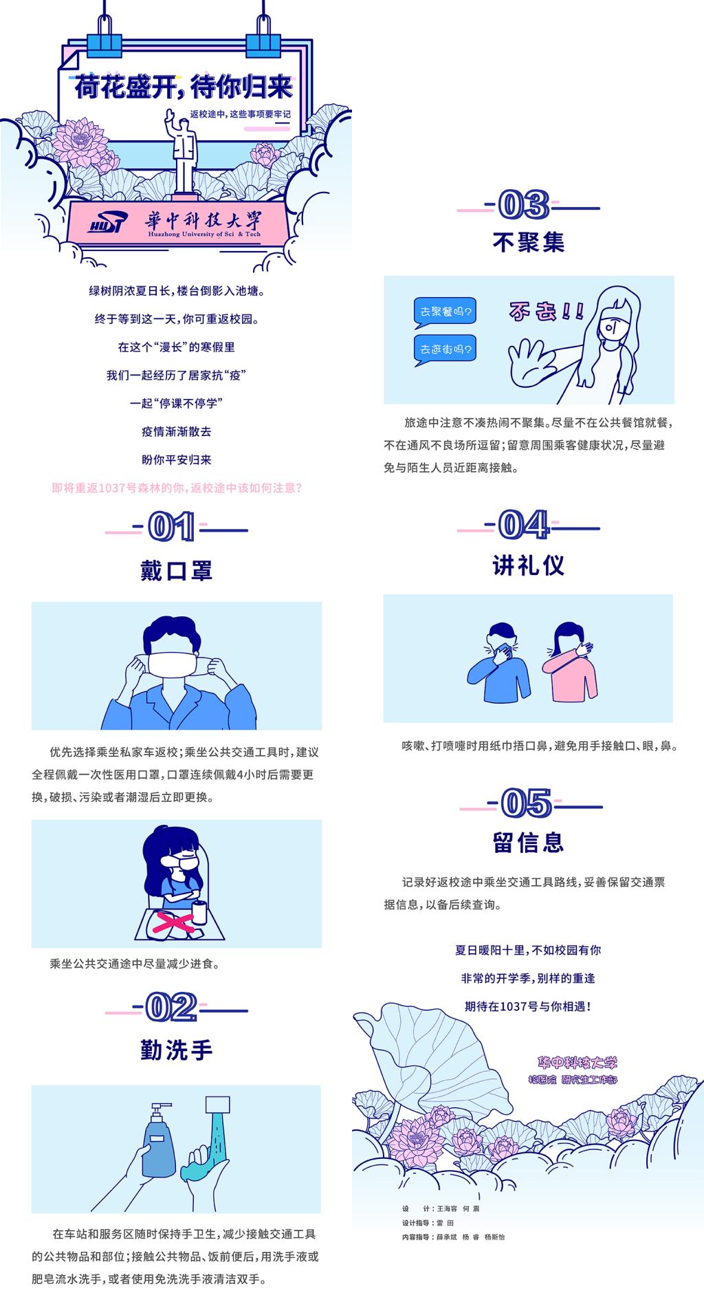 指南内容主要包括“戴口罩、勤洗手、不聚集、讲礼仪、留信息”五个方面,并且做了可视化设计,阅读起来舒适、高效。在主题元素上选择了学校南大门和毛主席雕像来呈现校园的特色标识,同时以简洁的线面结合风格来表现校园里正在盛放的荷花,表示对返校学子的殷殷期待,与主题“荷花盛开,待你归来”相呼应。